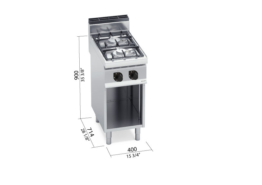 Plano de trabajo y paneles frontales de acero inoxidable AISI 304. Quemadores de larga duración enteramente en hierro fundido niquelado de simple y doble corona de alta potencia accionados por grifo valvulado con termopar de seguridad e indicador luminoso piloto. Parrillas de hierro fundido. Bandejas extraíbles para la máxima higiene y para un fácil mantenimiento. Pies regulables. 2 fuegos de 7 Kw Ø 110 Potencia total: 14 Kw. Dimensiones: 400x714x900
