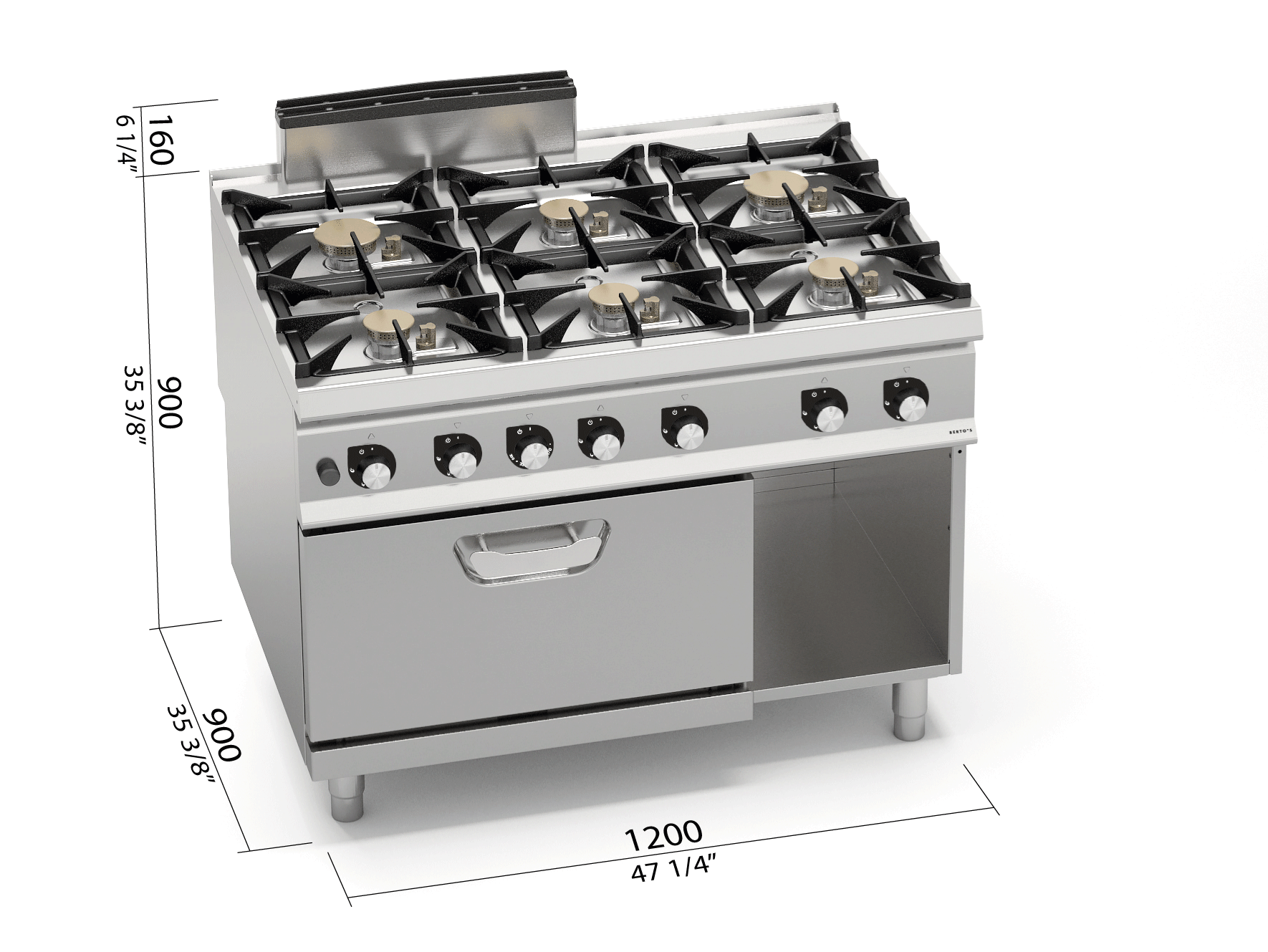 Plano de trabajo de acero inoxidable AISI 304 con espesor 20/10, paneles frontales y laterales de acero inoxidable AISI 304, acabado Scotch Brite. Quemadores de hierro fundido y distribuidores de llama de latón estancos a los líquidos fijados en la superficie de acero AISI 304 de embutición profunda, dotados de termopar de seguridad y llama piloto protegida por cubierta de acero para una fácil limpieza y mantenimiento con cuerpo íntegramente de latón. Quemadores de triple perforado compactos de alta eficiencia térmica de 6 kW con 90 de diámetro y de 10 kW con 120 de diámetro. Horno a gas con quemador de llama auto-estabilizada posicionado debajo de la solera nervada de acero y termostato regulable de 160 a 280 °C. Cámara horno de AISI 430, con soportes de 4 niveles y contra puerta estampada y nervada de acero inoxidable. Chimenea interna de acero inoxidable y quemador de acero inoxidable AISI 304. Manija con doble molde de alta resistencia de acero inoxidable AISI 304. Circulación agua en el sumidero con rebosamiento. 4 fuegos de 6 Kw Ø 90 , 2 fuegos de 10 Kw Ø 120 Dimensiones horno: GN 2/1 530x650x 4 pos. 550x685x295 Potencia horno: 7,80 Kw. Potencia total: 51,80 Kw. Dimensiones: 1200x900x900