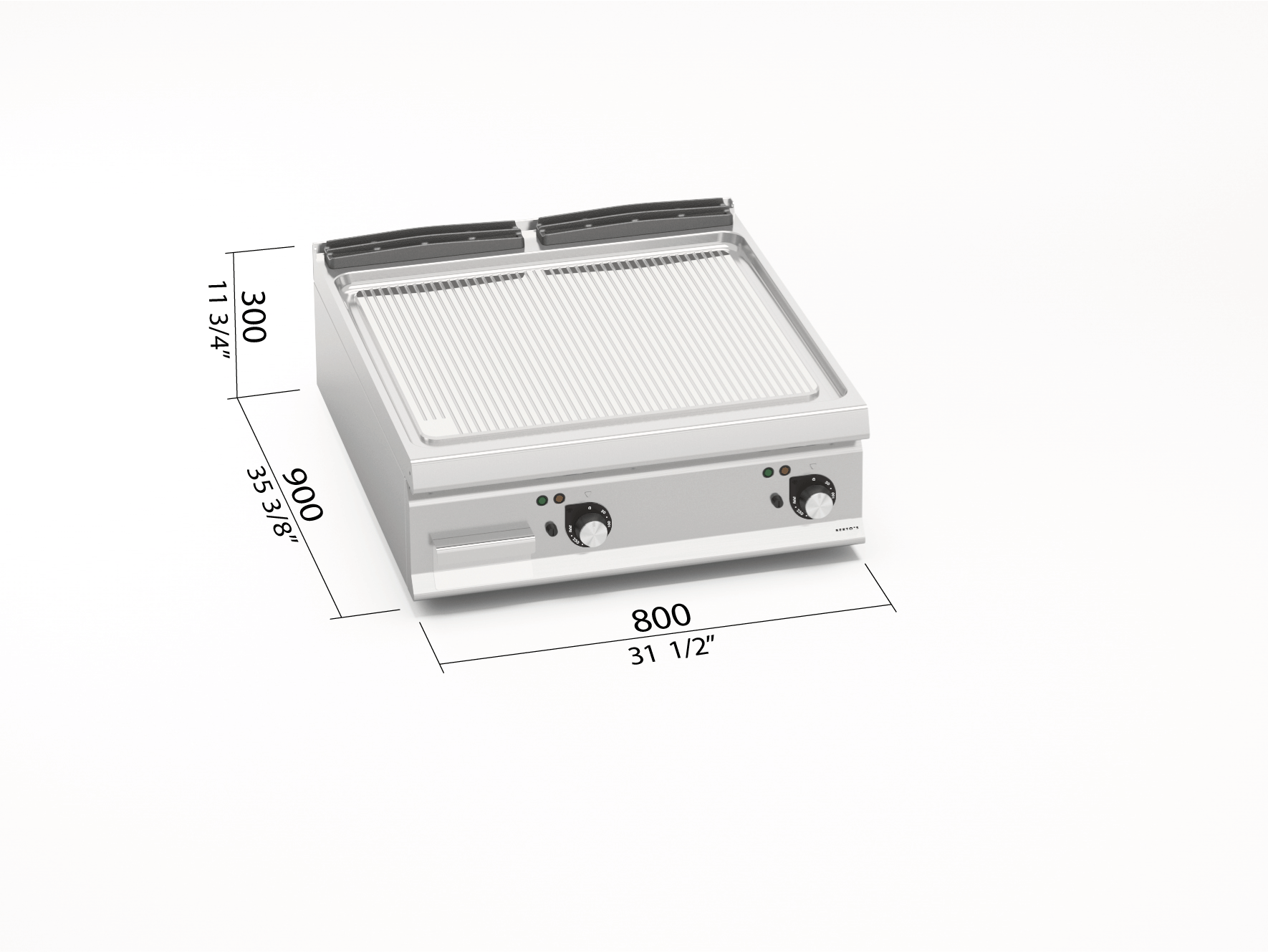 Plano de trabajo de acero inoxidable AISI 304 con espesor 20/10, paneles frontales y laterales de acero inoxidable AISI 304, acabado Scotch Brite. Resistencias de acero inoxidable incoloy colocadas debajo de la placa de cocción. Control termostático y termostato de seguridad de rearme manual. Regulación de la temperatura de 50 a 270 °C. Indicador luminoso de línea e indicador luminoso de alcance de temperatura. Plancha rayada de alto espesor. Dos zonas con mandos separados para una regulación independiente y óptima de la temperatura. Plancha de cocción de dos componentes que combina una lámina de acero, para optimizar la uniformidad, con un revestimiento superior de acero inoxidable AISI 316 con acabado brillante, para una óptima limpieza y un bajo nivel de irradiación, con consiguiente mayor confort para el operador. Orificio de descarga de grandes dimensiones y transportador en contenedor especial con cierre hermético. Dimensiones placa: 710×635 , 4510 cm2. Potencia: 13,20 Kw. Voltaje: 380-415 V3N. Dimensiones: 800x900x300